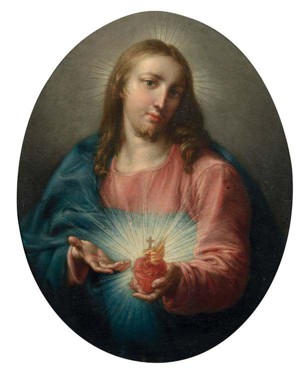Pompeo Batoni (1708-1787) è autore della più famosa immagine del s. Cuore. La realizzò su rame per la cappella della  Chiesa del Gesù a Roma, ispirandosi alle visioni di s. Margherita Maria Alacoque (1647-1690). Cristo è rivestito di una tunica rossa e un manto blu (i colori dell’umanità e della divinità); con la mano destra indica il Cuore irraggiato da fiamme e coronato di spine, con una croce sulla sommità.